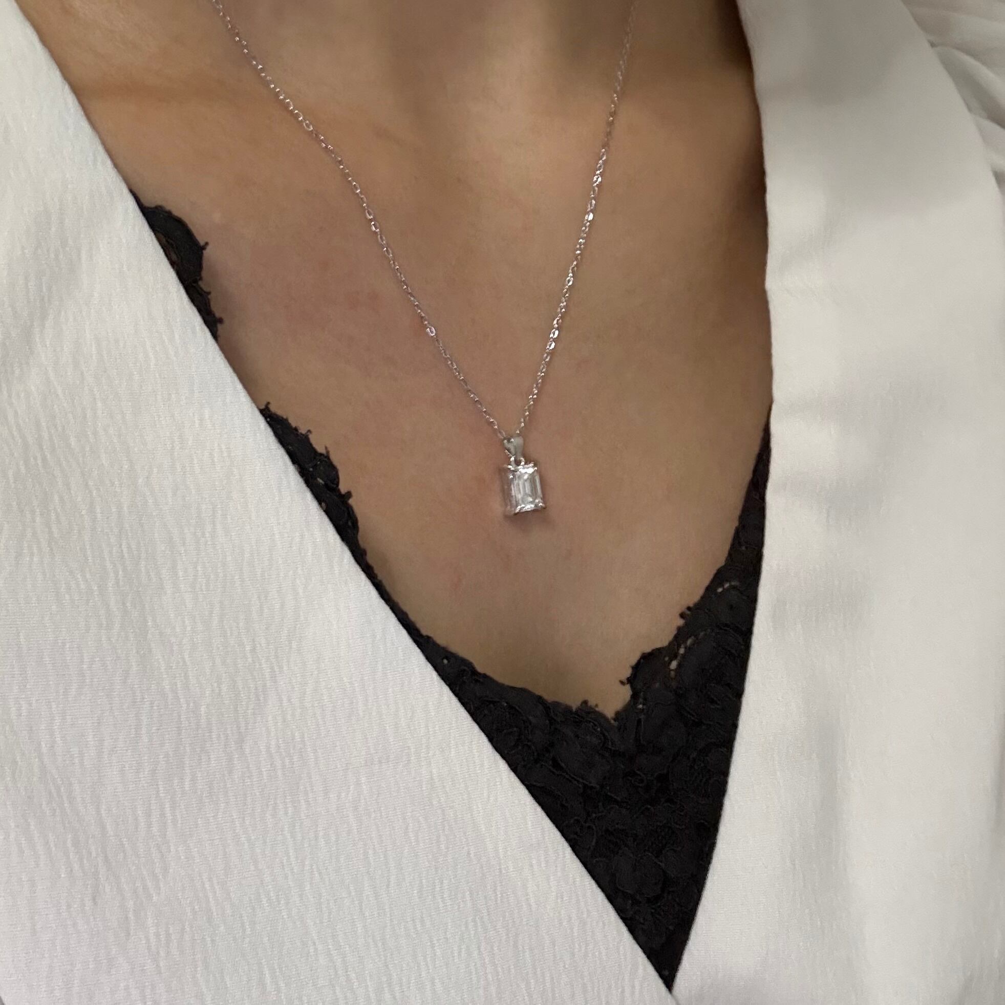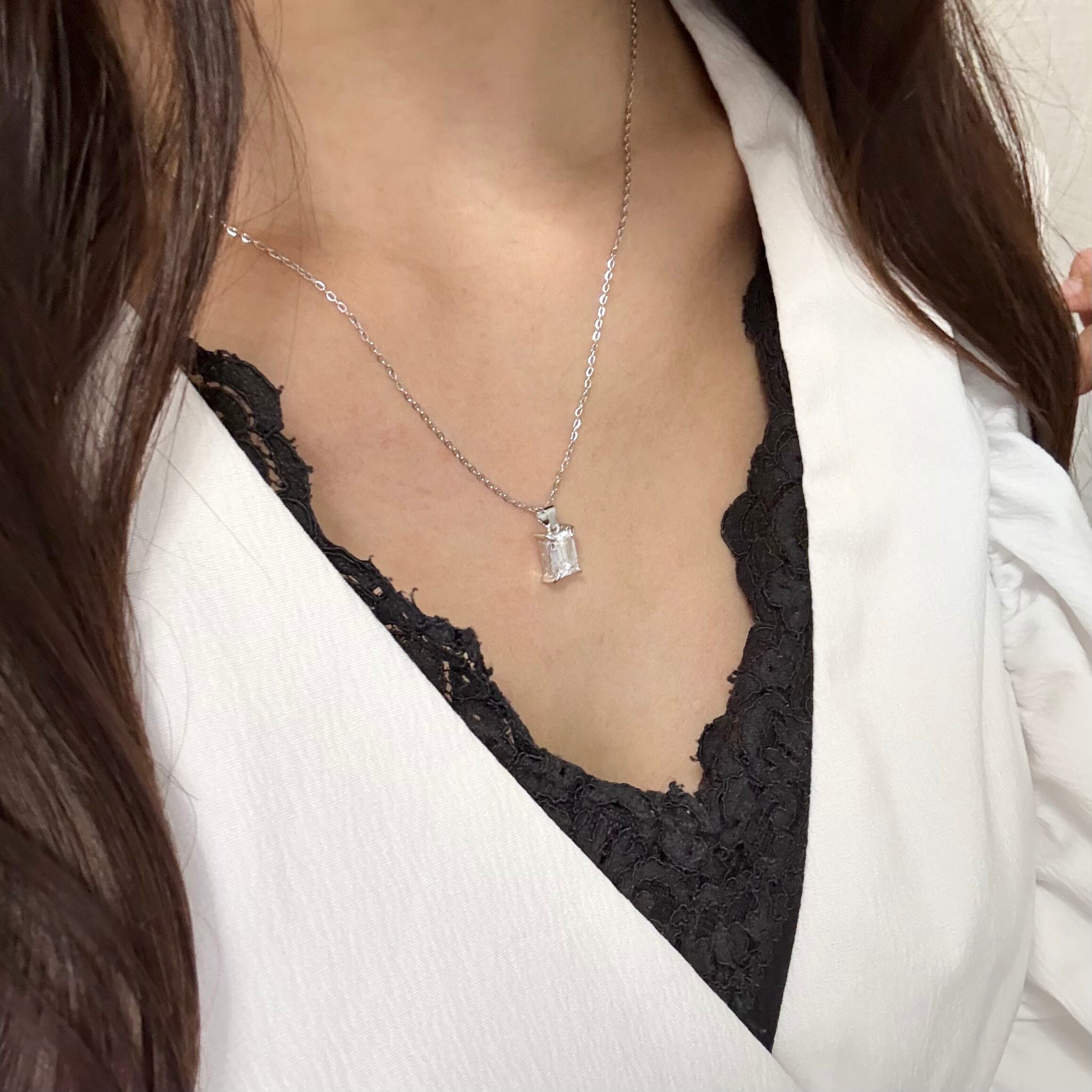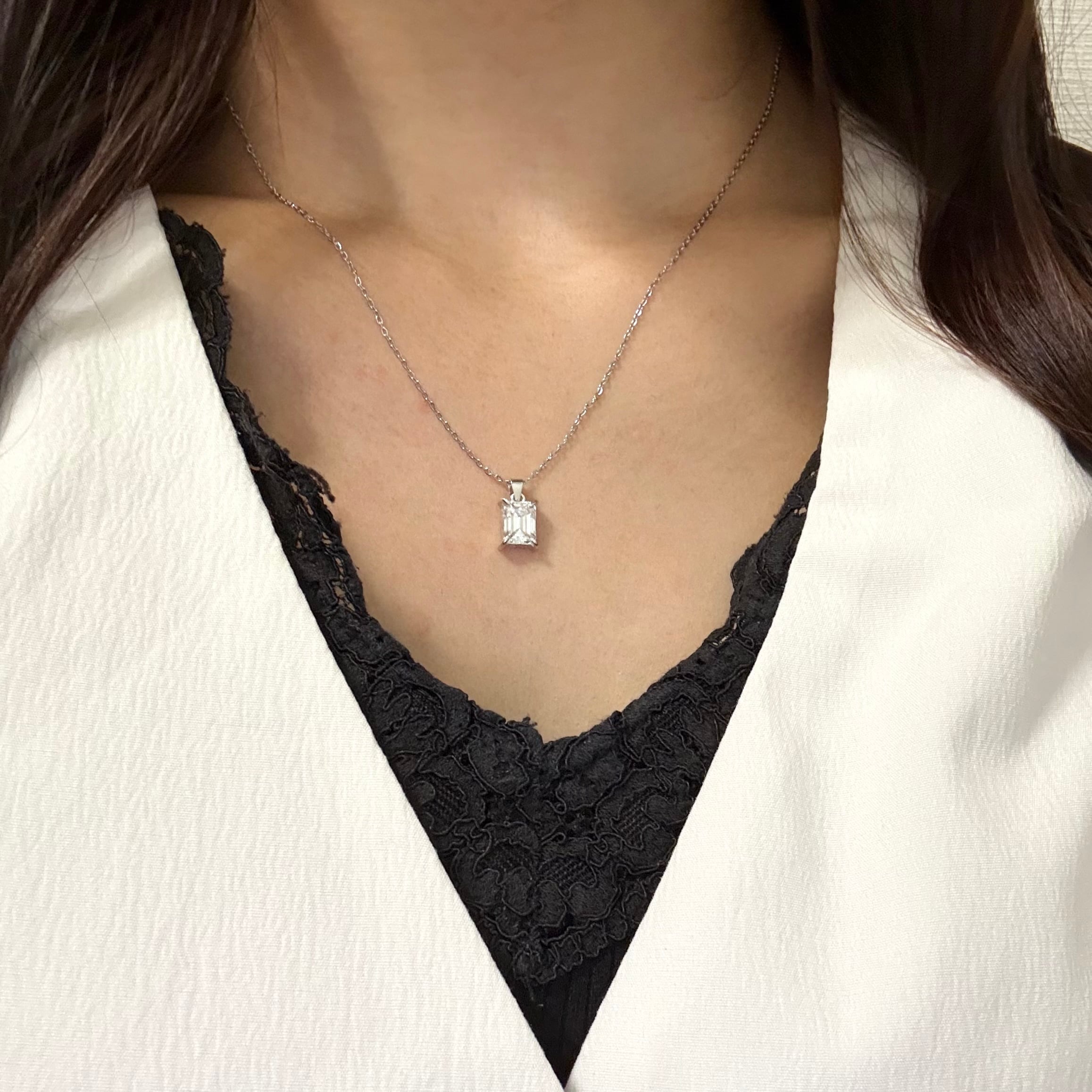 透明感と切れ味を兼ね備えたエメラルドカットが、装いを選ばず首元を凛と彩る。
