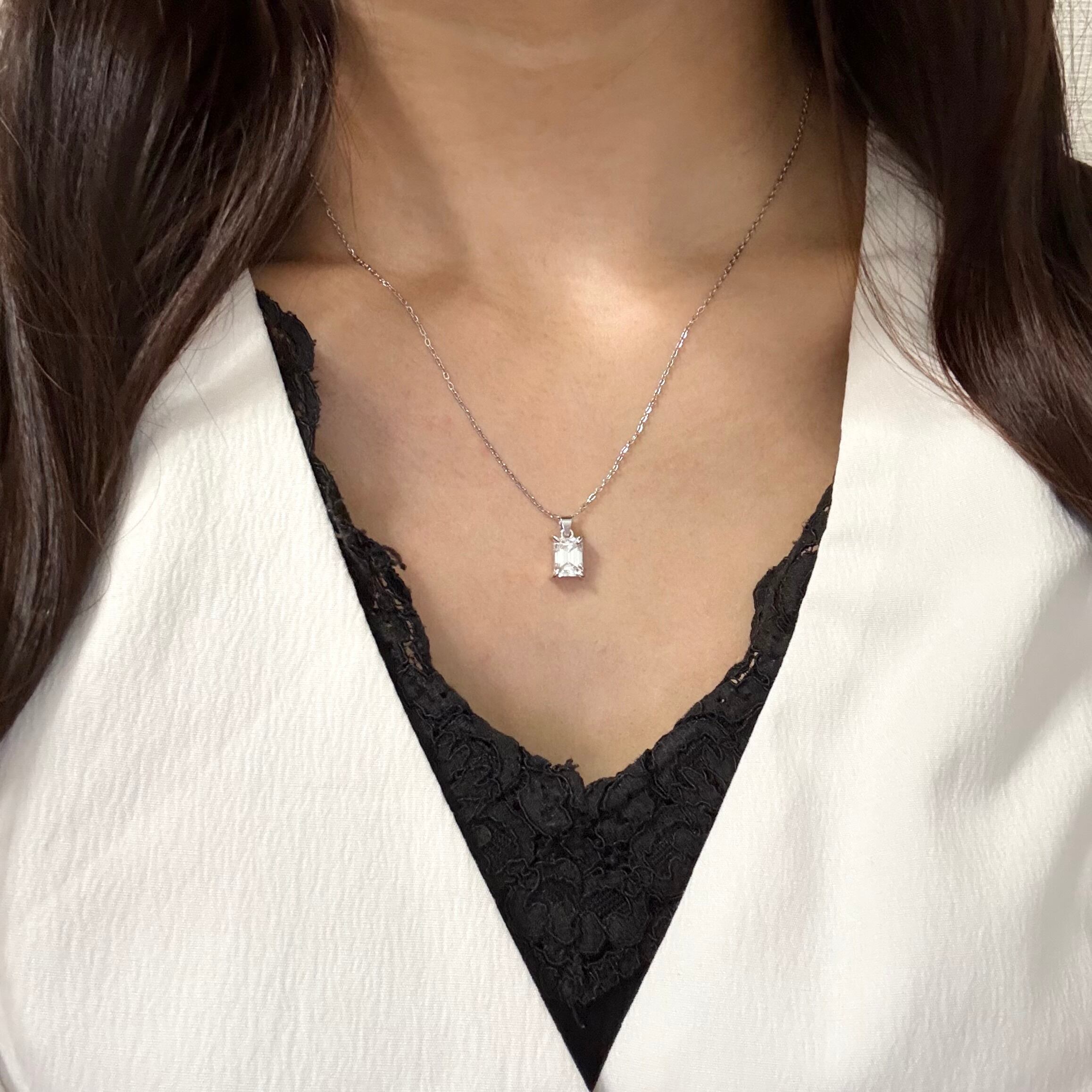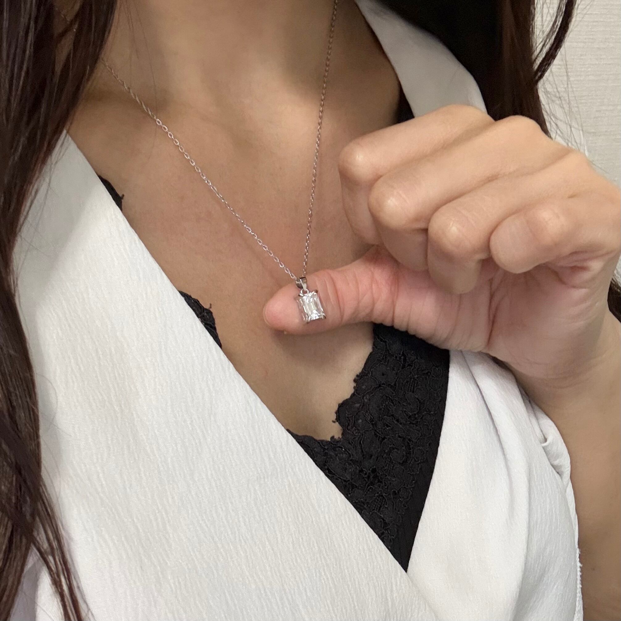 2.0カラット相当(8×6mm)・Dカラー・エメラルドカットのモアサナイトが、シルバーチェーンに溶け込むように輝きます。