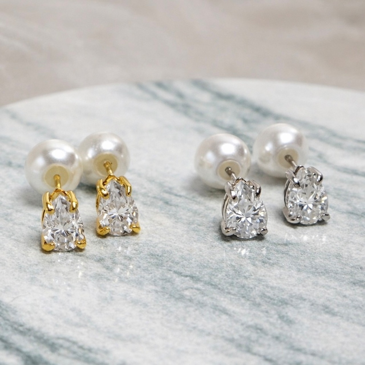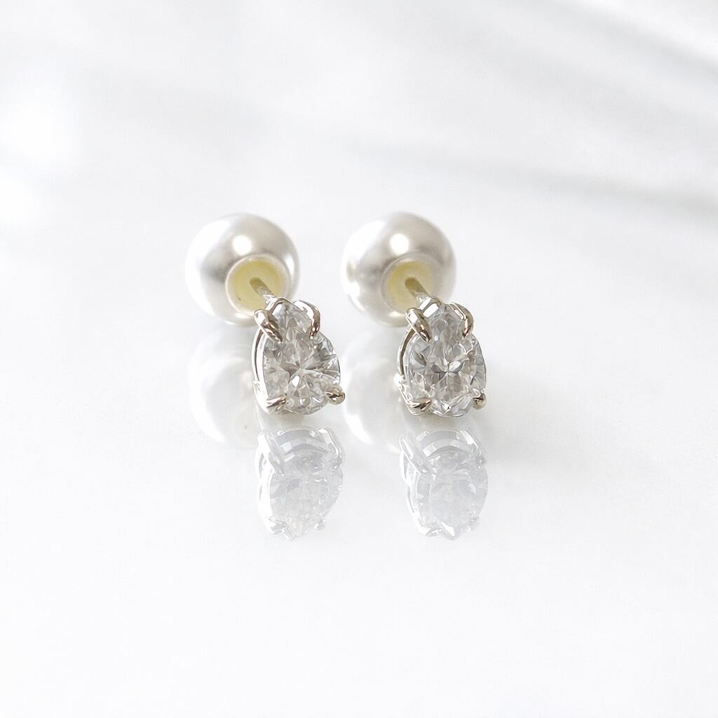 正面からは透明感あふれるペアシェイプのモアサナイトが、後ろ姿からは柔らかな光沢のパールが覗き、どこから見ても美しく映えるデザインに仕上げました。
